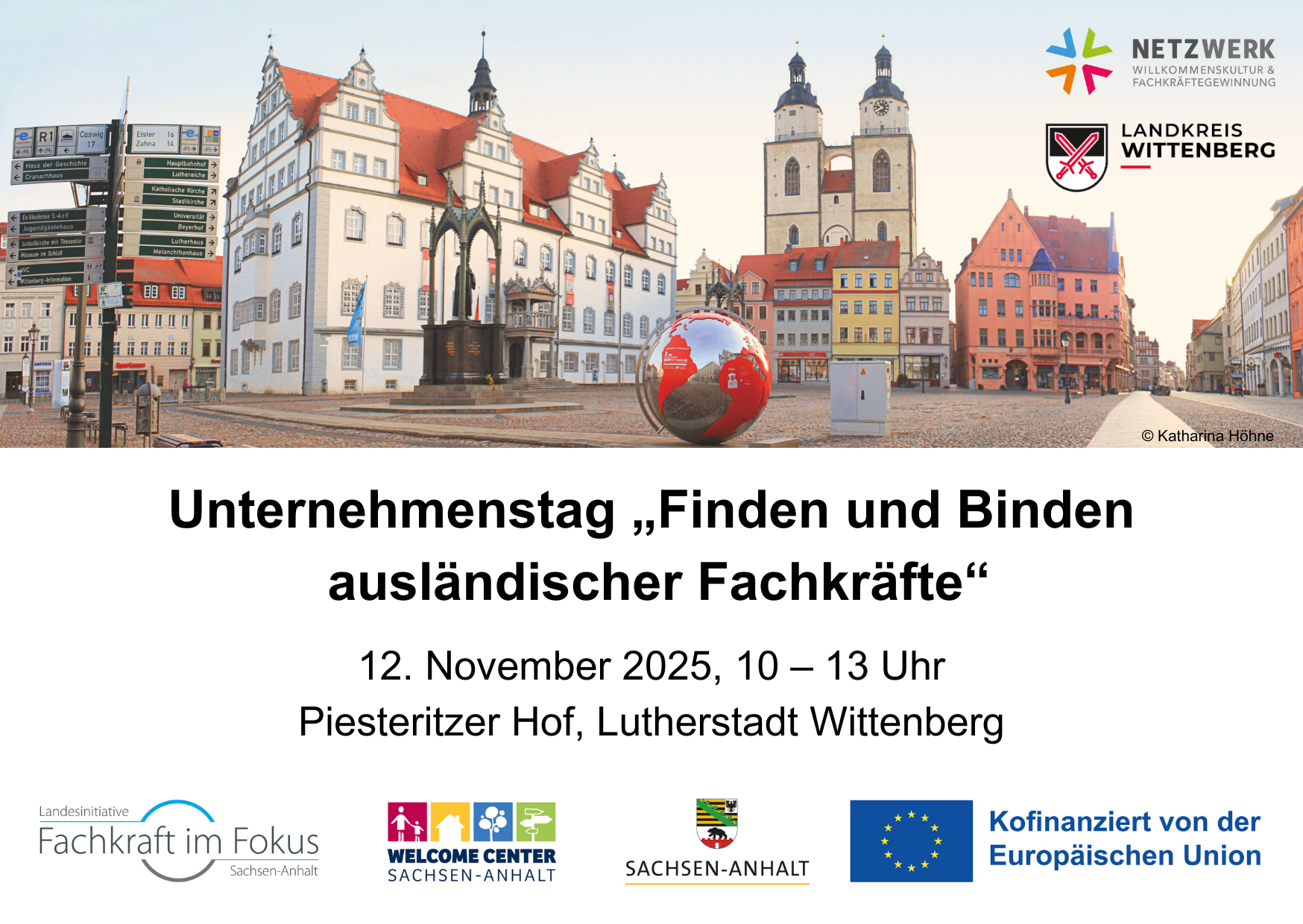 Das Netzwerk Willkommenskultur und Fachkräftegewinnung, der Landkreis Wittenberg und das WelcomeCenter Sachsen-Anhalt laden Sie zur Veranstaltung „Finden und Binden ausländischer Fachkräfte“ ein: